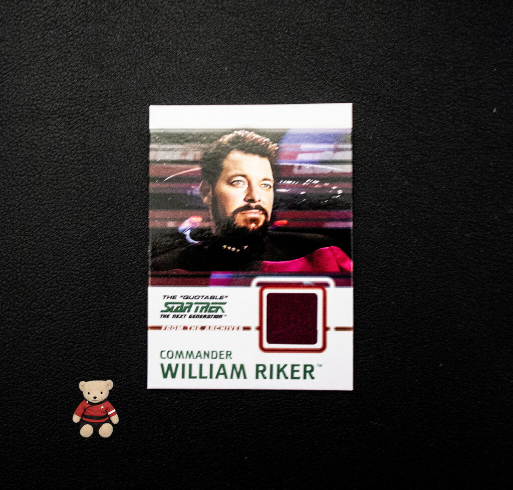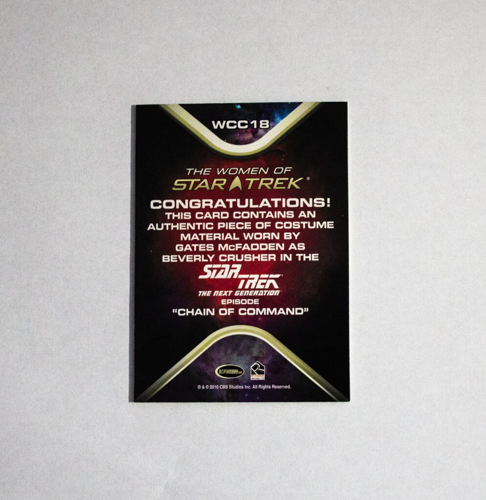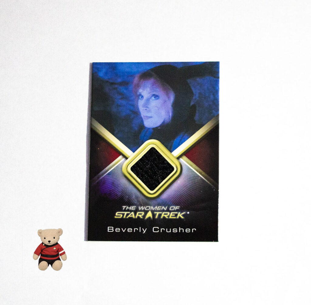 Here’s another example of the different types of costume relic cards. This one of Dr. Crusher actually names the episode it was worn in.